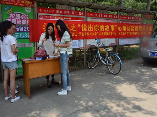 (本站讯)聆听时光的絮语,凝望流年的风景。为给我校学生搭建一个敞开心扉,打开心结,分享成长经验的平台,让更多的同学能够乐于倾吐自己的心声。5月18日中午,由学生工作处大学生心理健康中心主办,我院心理发展部和三月剧社联合承办的《对话》之“说出你的故事”心理访谈微视频大赛宣传活动于第二、三餐厅门口顺利进行。