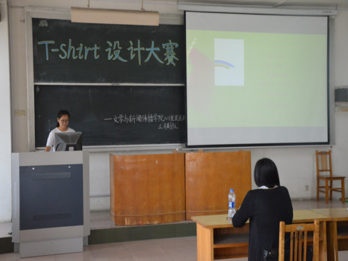 比赛共分为两个环节:PPT展示环节和作品现场展示环节。参赛选手完成以上两个环节后,由评委进行点评和现场打分。比赛伊始,第一位参赛选手张福赫讲述了自己的参赛作品《路飞的希望》,他以曾经看过的经典动漫作品《海贼王》为创作灵感,设计的T-shirt独特又具美感,给人留下深刻的印象。随后,方莹的《用爱成长》给人带来温暖,张冬阁的《与自己握手言和》可爱又有意义,杨静的《深情不及久伴》时尚个性,李赛的《舞动青春》青春又富激情。各位参赛选手态度认真,创意新颖,赢得了评委的一致好评。