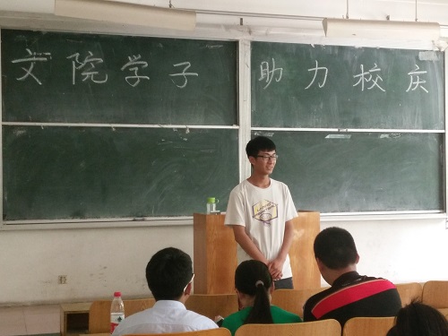 李永正讲道,在建校60周年校庆之际,文学院学生会向全院学生发出捐款倡议,为母校60周年献礼,为母校建设优质高等院校出力!因此学生会倡议:自愿为学校捐款,金额不限,重在积极参与,以充分彰显同学们的向心力和凝聚力。他再三强调,此次捐款全凭自愿,非强制性行为,旨在激发同学们的捐款积极性,根据各自实际情况捐款。此次捐款会以我院名义,上交到校友办,所有款项均用于校庆事宜。他希望各班班干部以及学生会骨干起到良好的模范带头作用。会后李永正又对学生会其他工作做出部署,发放了校庆日当天的学生就餐餐券。