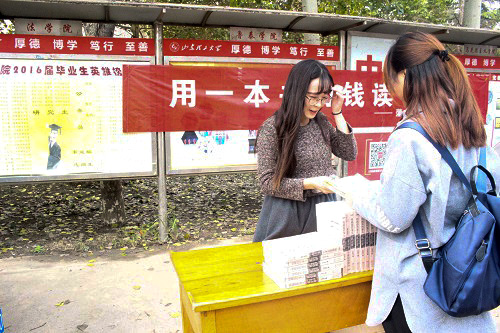 (本站讯)“用一本书的钱读一套书”,让阅读的快乐接连传递。10月28日上午,蒲公英文学社和稷下书吧工作人员于西校第二、三餐厅和东校各餐厅进行为期两天的“省钱阅读”宣传活动,此次活动由蒲公英文学社和稷下书吧联合举办,旨在倡导“省钱阅读”,为广大爱好读书的同学们提供良好的读书平台。