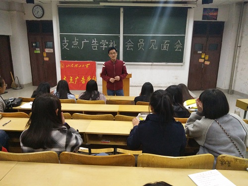 (本站讯)为增强会员对支点广告学社的了解,促进会员之间沟通交流。10月30日晚,我院支点广告学社2016级会员见面会于东校三号教学楼309教室举行,社长于吉伟主持会议,支点广告学社全体会员参加。