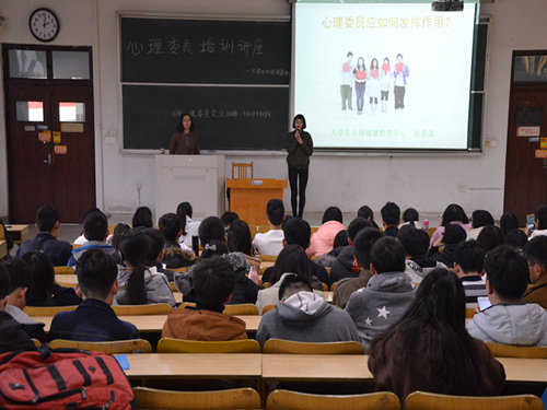 (本站讯)为使各班心理委员更好地协助学院或心理健康教育中心在班级开展相关工作。11月10日下午,心理委员培训讲座于东校区3号教学楼310教室举行。大学生心理健康教育中心张爱莲、滕亮担任主讲人。