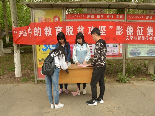 活动伊始,权益部的成员们采用挂横幅、发传单、口头表达的形式向同学们及时传达此次活动的参赛方式和具体内容,从而吸引更多有意向的同学踊跃报名参加比赛。紧接着,众多关心支持教育扶贫工作的同学和文艺爱好者当场对此次影像征集大赛的举办细节进行了详细的询问和了解并主动积极报名参加,同学们各抒己见,参与氛围活跃热烈。此次参赛影像档案应从实际出发,坚持思想性、真实性、艺术性、审美性相统一,以教育脱贫攻坚为主题,积极响应党的十八大及习近平总书记系列重要讲话精神,向广大师生传递教育强民、技能富民、就业安民的正能量,杜绝脱离实际、投其所好的虚假拍摄。据悉,参赛者将充分发挥自身的想象力和创造力以摄像作品或微电影作品的方式对身边的脱贫攻坚进行真实的记录和解说。此次比赛本着公平公正公开的原则,在调动开展教育扶贫攻坚工作积极性的同时也给同学们提供了一个展示自我创造能力的机会。