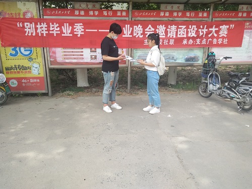 (本站讯)毕业季,放飞一份梦想,把未来追逐;拓展一片天地,把精彩绽放;挥洒一份辛劳,把理想播种;留存一份记忆,把美好刻录。为让即将到来的“毕业季”少一点遗憾,多一份精彩,给毕业生留下珍贵纪念。5月15日中午,由校社联主办、我院支点广告学社承办的校级“别样毕业季――毕业晚会邀请函设计大赛”宣传活动于东校区和西校区第二、三餐厅门口顺利进行。
