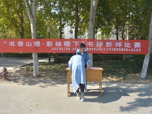 (本站讯)读书观影,分享感动。为进一步培养大学生爱读书、爱电影、爱思考、爱写作的习惯,引导学生形成积极的心态。近期,由学生工作处大学生心理健康教育中心主办,我院承办的“书香山理,影动稷下”书评影评比赛宣传活动在东西校区各大餐厅门口进宣传,心理发展部成员参加此次宣传活动。