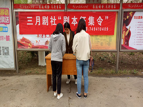 (本站讯)为丰富校园文化生活,为同学们提供展现自我创意和才华的平台。4月14日中午,由校学生会社团联合会主办、我院三月剧社承办的剧本征集令比赛宣传活动于西校区第一餐厅、第二餐厅及东校区各餐厅门口开展。