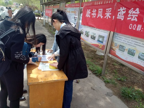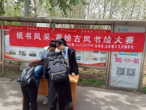 一大早,国学社负责宣传活动的成员便奔赴各大餐厅门口,拉起横幅,摆上桌子,准备好报名表和宣传单,等待感兴趣的同学前来报名。不一会儿,前来咨询报名的同学们便将宣传点团团围住。国学社负责宣传的工作人员耐心地为同学们讲解纸鸢和书画的历史并且解答同学们关于比赛的疑惑。准备报名参加比赛的同学各个都情绪高涨,想要在活动中找到乐趣,并且取得一个好的名次。