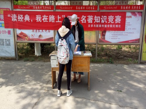 (本站讯)花开灿烂时,立学读书日。为迎接第二十三个世界读书日,传递阅读正能量。4月18日,由我院红烛社主办的“读经典,我在路上”——四大名著知识竞赛宣传活动于西校区第一餐厅、第二餐厅及东校区各个餐厅门口开展,红烛社社长高子惠和社员们认真准备。