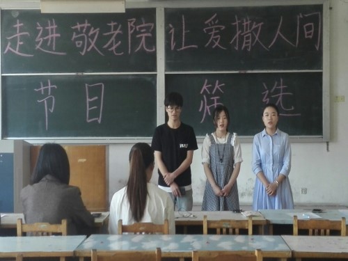 (本站讯)走进敬老院,让爱撒人间。5月3日下午,三月剧社在1号教学楼312教室举行走进敬老院义演的节目筛选。雷锋社团副部长曾繁林及三月剧社部分干事担任此次节目筛选的评委。