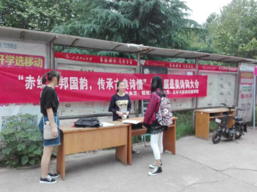 活动宣传期间,宣传人员通过悬挂条幅、分发单页等方式积极向同学们宣传此次比赛的重要内容和具体流程。宣传人员热情详细的讲解,吸引了更多有意向的同学报名参加比赛。第二届“中华最美诗词大会”分为初赛和决赛两个阶段,初赛采用线上选拔的方式,参赛选手自由组队,形成3人小组作为团队进行参赛。小组3人将进行线上答题,取平均分,最终排名前8的团队进入决赛的角逐。决赛采用现场答题方式,分为龙争虎斗、金榜题名上下两场。决赛还将邀请相关专业老师,进行现场打分点评。随后,现场宣传人员向大家详细介绍此次比赛的报名方式,鼓励大家从线上线下积极报名参与。宣传期间,众多诗词爱好者前来咨询和报名,并积极询问比赛的相关内容和具体流程,活动现场气氛活跃。