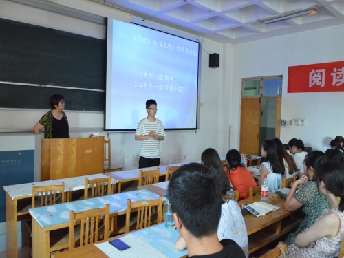 接下来,王梅就《围城》和《边城》两本书做了具体分析。首先,王梅找了几名熟悉《围城》的同学对这本书进行了简要介绍。王梅表示:“围在城里的人想出来,城外的人想冲进去,对婚姻也罢,职业也罢,人生的愿望大都如此”。随后,王梅概括介绍作品作者钱钟书先生的生平,对书中的主人公方鸿渐、唐晓芙、孙嘉柔等人进行性格分析。在老师和同学的热烈讨论中,总结出《围城》一书的亮点表现在其奇妙的语言、辛辣幽默的讽刺意味和精致研究的学者风气。针对书籍《边城》,王梅就情窦朦胧的翠翠、无力回天的爷爷及互相谦让的天保兄弟进行了人物性格分析。她认为《边城》的美展现在空灵剔透的山水之美、心地善良的人性之美、浑然天成的文字之美、伤怀感人的悲剧之美、清新悠远的理想之美五个方面。同学们积极地配合老师,主动地将自己的想法和感受与大家交流讨论,读书会气氛活跃温馨。最后,王梅祝愿同学们心中要少一座围城,多一座希腊小庙,幸福快乐的过好每一天,为梦想努力奋斗。