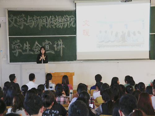 为让新生尽快了解学生会各部门主要职能,使学生会吸纳更多优秀人才。会议伊始,第十八届学生会主席盖奕洁简要介绍院级学生会组织的主要工作以及学生会发展情况,并对新生的到来表达了热烈欢迎。之后,各主席团成员以学生会的主要职责是全心全意为同学服务为主线,通过多媒体播放ppt、视频等方式结合学院文化用精彩的演讲向同学们介绍了所在部门职能、组织架构、工作方向,并重点展示了部门风采,宣传介绍了各中心、各部门在成员们的努力下取得的特色与成果,与大家共同分享部门举办活动时的服务精神与团结友爱,充分展示出我院学生会温暖融洽的氛围。各主席团成员各具风格的讲解给新生留下了深刻的印象,睿智幽默的宣讲内容得到阵阵掌声,将宣讲会气氛推向高潮。之后,盖奕洁从几个方面进行总结发言。第一,要准确定位,明确职责,学生会是一个为同学服务的学生组织。第二,她希望新生可以根据自己的喜好挑选部门,有取有舍,选择最适合自己的工作。第三,她鼓励新生们能积极通过学生会平台发挥自己的才艺,锻炼自己的能力,尽早融入大学生活。