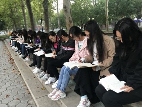 每周四,2018级全体学生携书本在中心花园进行晨读。活动开始前,各班级集中征求全体同学的意见,选择晨读书籍。同学们通过诵读诗词,温习所学功课;通过背诵单词,增加英语学习,积极备战英语考试;通过朗读经典名著,体会人物性格,陶冶情操,开阔视野。此外,单词、诗词、经典名著等各式各样的晨间读物展现了我院同学们广泛的阅读兴趣和良好的知识素养。