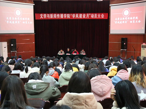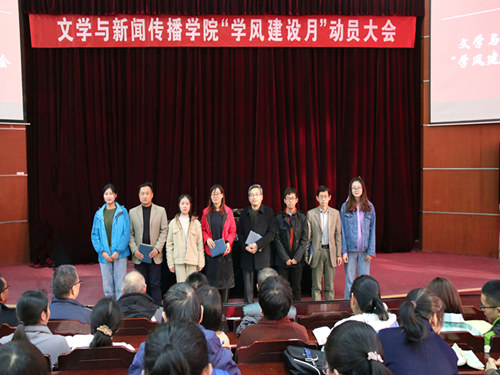 随后,孙钦泉宣读《文学与新闻传播学院2018年“学风建设月”活动方案》,对学风建设活动做出工作部署。他对活动目标、组织机构、具体措施进行了详细解读,明确了加强师德师风建设、规范课堂教学、搭建交流平台、提高服务水平、打造工作特色、完善制度保障、强化典型示范等工作重点。接下来,学院领导班与联系班级代表进行了对接,正式启动了领导干部联系班级工作。院学生会主席盖奕洁向全体同学发出倡议,号召同学们学有所志、学有所为、学有所恒,共育优良学风,共享乐学生活。而后,教师代表高慧艳老师在会上发言,强调好大学最大的功用是让学生渴望变得优秀,重塑学生的精神内核,思维模式、眼界和格局都会迥然不同。好教师要做学生的良师益友,怀揣责任、心中有爱,明确教书育人职责,成为“五有”人才的引路人。学生代表林梦真建议同学们明确责任,勤奋学习,敢于尝试,勤于实践,以主人翁的姿态积极参与学风建设活动,争做“五有”青年。