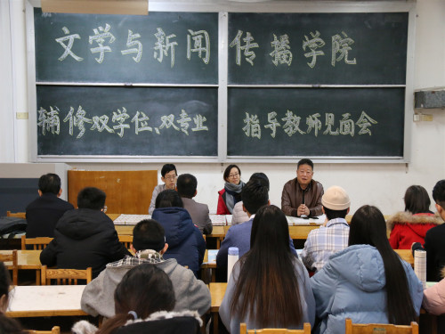 (本站讯)11月23日,我院在1号教学楼321教室顺利举行辅修双学位、双专业指导老师见面会。我院院长张艳梅,副院长王圣、吕逸新,指导教师柏秀叶、范爱贤、马宏基、岳庆云、于志强、岳守雯以及2015、2016级文学辅修专业学生参加。会议由范友莲主持。