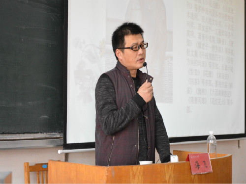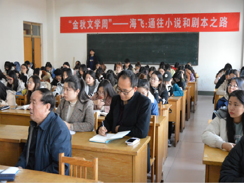 (本站讯)11月26日上午,“金秋文学周”系列活动之海飞专场讲座在1号教学楼312教室举行。中国作协会员、国家一级作家海飞担任主讲,淄博市作家代表与我院师生代表参加此次活动。