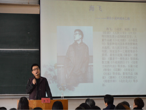 讲座伊始,主持人首先向大家介绍海飞的个人经历、代表作品、获奖情况,并代表学院对海飞的到来表示热烈欢迎。随后,海飞以“通往小说和剧本之路”为主题进行专题讲座。他从小说与剧本的不同之处谈起,分享自己对于小说和影视发展的看法。他提到,小说的出版需要得到编辑的认可,而剧本的创作则需要考虑如何快速吸引读者兴趣、如何发展主题先行的理念、如何迎合受众群体的需求,相较于小说,影视文学所承担的风险更大。接着,他从时代发展层面剖析小说与剧本的发展之路。他认为,小说是时代的产物,依赖于所处的时代生存发展。在当今社会中,依托于电视媒体、网络平台的影视作品与小说相比,发展相对较快,受到的关注度更高。针对这一方面,他提到,小说创作更需要持之以恒,创作者在坚持每天写作的同时,应该学会关注影视作品,并汲取影视作品中优秀内容,并加以运用,使作品更加生动贴切,从而达到极致化写作的理想状态。
