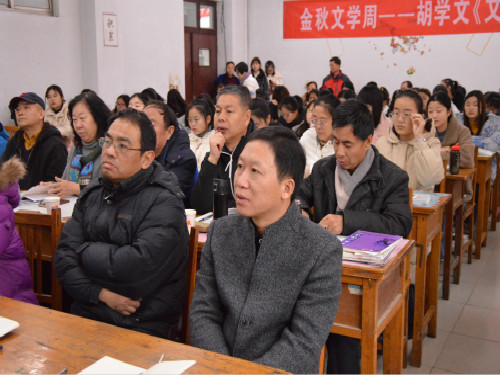 而后,胡文学提出关于时间的思考,并通过对博尔克斯《双面派》的分析,进一步强调写作要注意对时间的处理。之后,胡文学讲到,文学是人类成长的精神史。他提到人的成长分为身体的成长、知识的成长和精神的成长,而精神的成长就是要懂得尊重,爱与悲悯,而这些只能从日常的生活去体味、去学习。胡学文还讲到,文学是人类情感的传递,它能帮助我们去表达我们的某些情感,也能让我们更加深刻的去领会文字所表达的情感。接着,他讲到,文字能让我们走进人性的幽暗地带,体味人性的复杂,它就像一面镜子,能帮助我们认识自己、审视自己,教会我们思考。他还向在场的师生推荐了《小萝莉的猴帅大叔》《第四十一》《良心》等作品,鼓励大家去阅读。胡学文讲道,文学是灵魂的课堂。文学是世界的花朵,它能为世界增添很多色彩。文学虽然没有实用价值,但拥有间接价值。最后,进入到观众提问的环节,胡学文对文学的题目、文学边缘化以及人性的问题和同学们进行了探讨,观众们也积极参与,热烈探讨,气氛活跃。