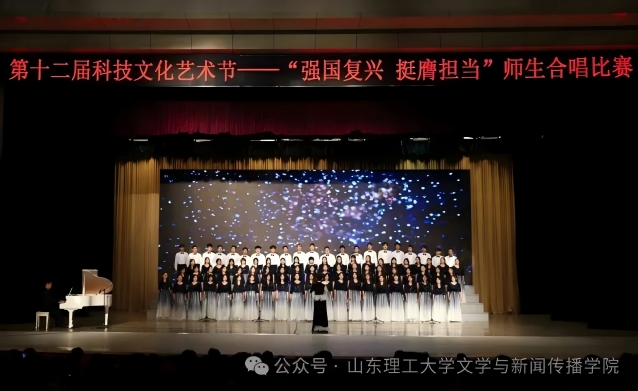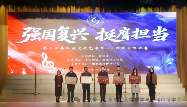 10月25日下午,山东理工大学第十二届科技文化艺术节“强国复兴 挺膺担当”师生合唱比赛在大学生艺术中心礼堂举行。我院师生合唱团凭借出色的表现,以优异成绩斩获一等奖!