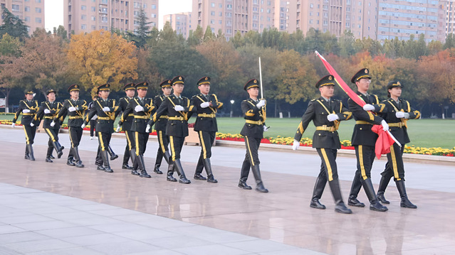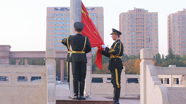 在《出旗曲》的伴奏下,全体师生庄严肃立,国旗护卫队迈着铿锵有力的步伐,护送国旗入场。五星红旗在激昂的《义勇军进行曲》声中冉冉升起,在场师生高唱国歌,行注目礼。清晨的阳光下,迎风招展的国旗与师生们昂扬的精神风貌相得益彰。