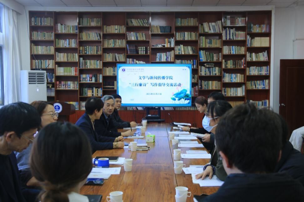 为深入推进“清廉文苑”建设,持续打造“廉言书语”廉洁文化教育品牌,11月27日下午,我院于2号教学楼润星书屋举办“三行廉诗”写作指导交流活动。校党委常委、统战部部长吕延苹,文学与新闻传播学院党委书记李义勇、院长张艳梅、党委副书记刘晓东、副院长吕逸新,中文系教工党支部党员教师高媛、张相宽、张立新、陈宁,国学社会员与“三行廉诗”作者代表参加活动。