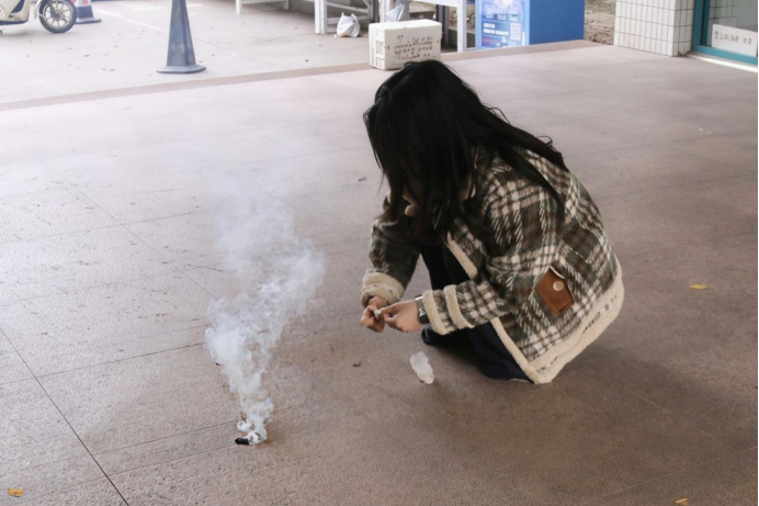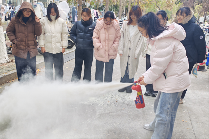 演练还设置了灭火器实操教学环节。工作人员指导学生从消防设施柜中取出灭火器,详细讲解“提、拔、握、压”的使用口诀与注意事项,并指导学生上手操作,亲身体验。