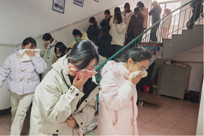 听到警报信号后,学生们迅速用湿毛巾捂住口鼻,弯腰低姿,在疏散组工作人员的引导下,沿预定路线快速、有序撤离。楼梯转角、楼栋出口等关键位置均有工作人员疏导人流、提醒安全注意事项,全程无推搡、无拥堵。学生们安全抵达紧急集合点后,各班迅速清点人数并上报,最终确认全员安全撤离,无一人遗漏。