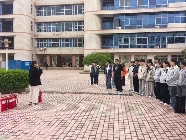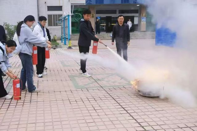 疏散演练结束后,师生们现场学习了灭火器“提、拔、握、压”的操作步骤及使用注意事项并进行了实操练习。